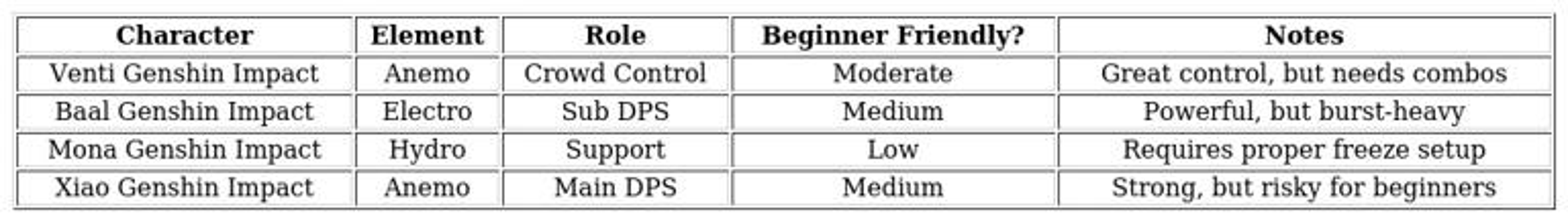 Don’t feel pressured to follow the current meta; some powerful characters like Venti or Baal are fantastic but may not be beginner-friendly due to their complex mechanics or gear requirements.
