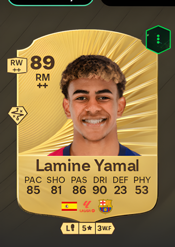 Lamine Yamal Nasraoui Ebana’s Gold Rare card stands out as a dynamic Right Midfielder, boasting an impressive overall rating of 89. With exceptional dribbling at 90 and a pace rating of 85, this card offers the perfect combination of speed and technical ability on the wing. His strong passing at 86 and solid shooting at 81 make him a constant threat in attacking situations, while his lower defense and physicality ratings highlight his specialization in offensive roles. As a sharp attacking player, Yamal’s card can help you rapidly break down opposing defenses, create scoring opportunities, and give your team the edge needed to secure victory in crucial moments.