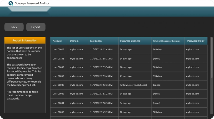 Password auditing tools can scan your Active Directory environment to identify accounts using weak, common, or previously breached passwords. These tools also help measure your policies' effectiveness against modern brute force techniques.