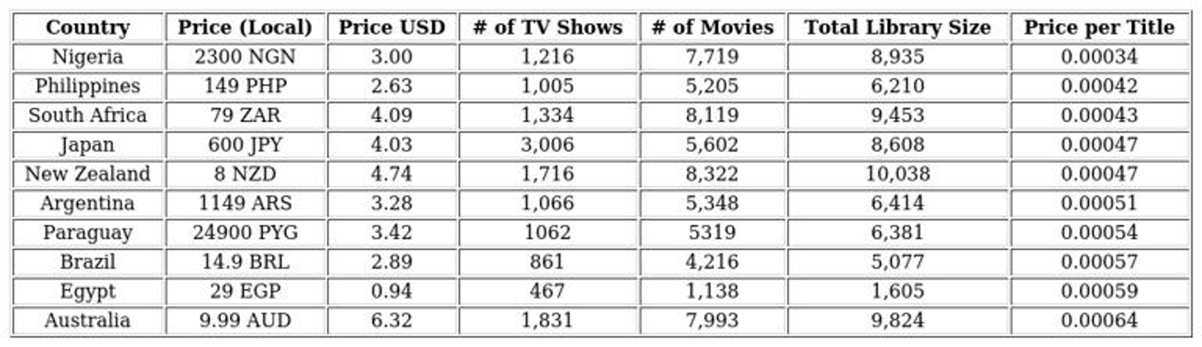 - South Africa: monthly fee $4.09, 9,453 titles, cost per title ≈ $0.00043.
